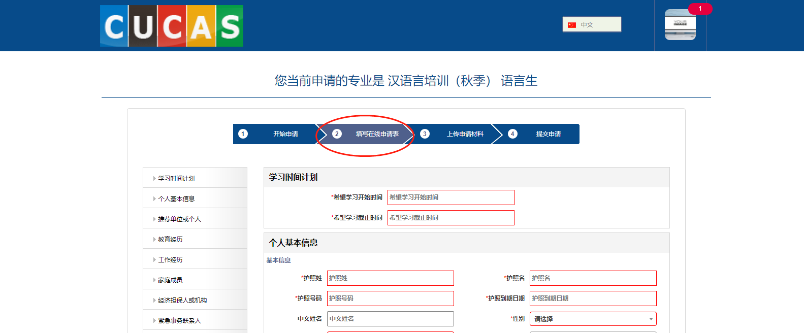 8、填写申请表 ( “*” 为必填)后,点击“保存下一步”。
